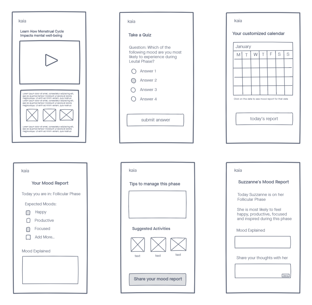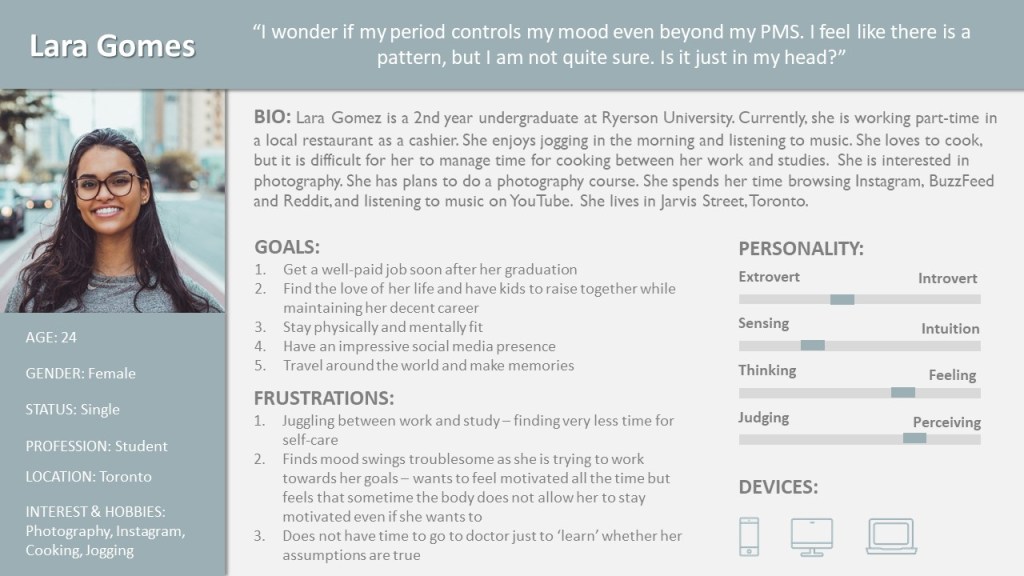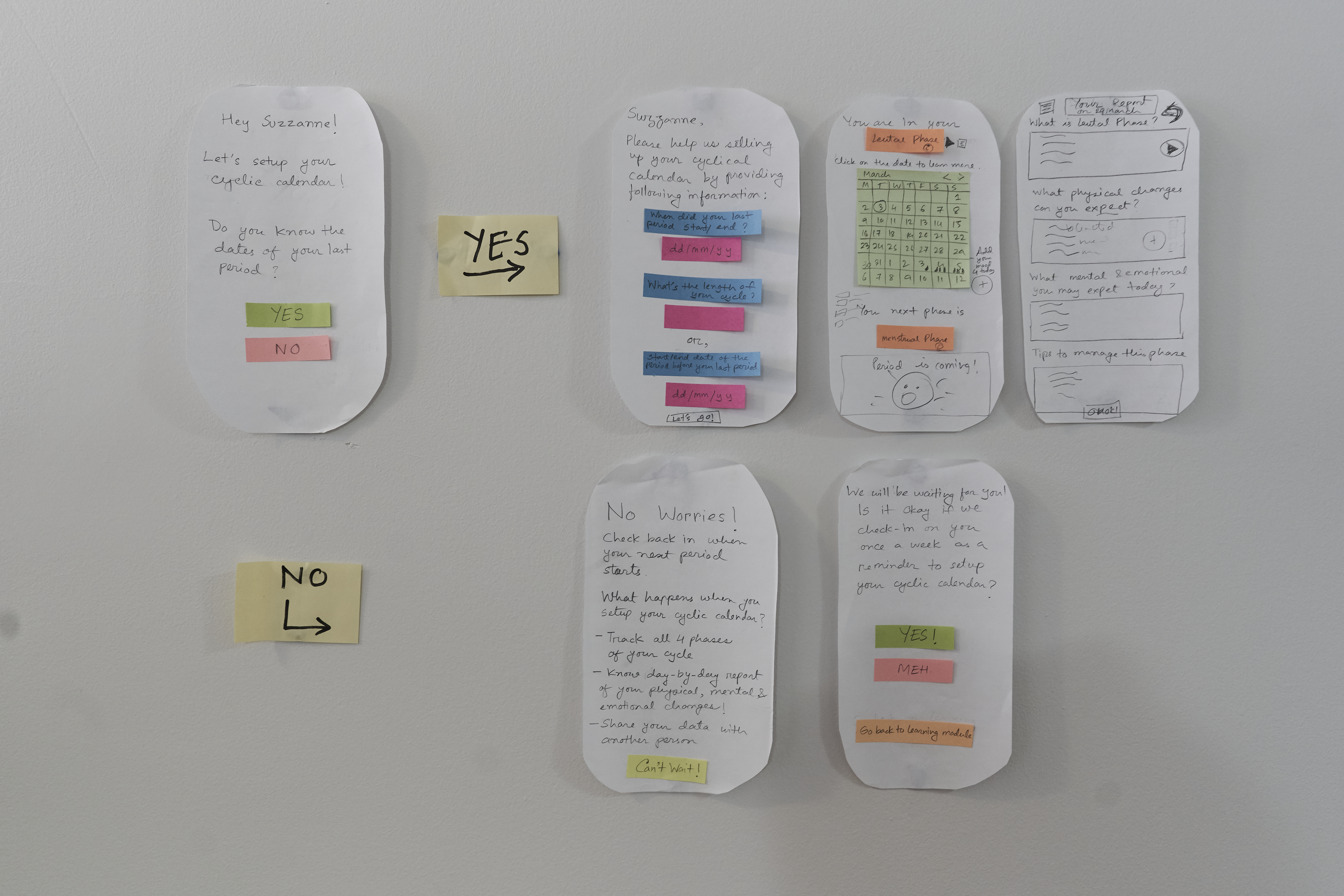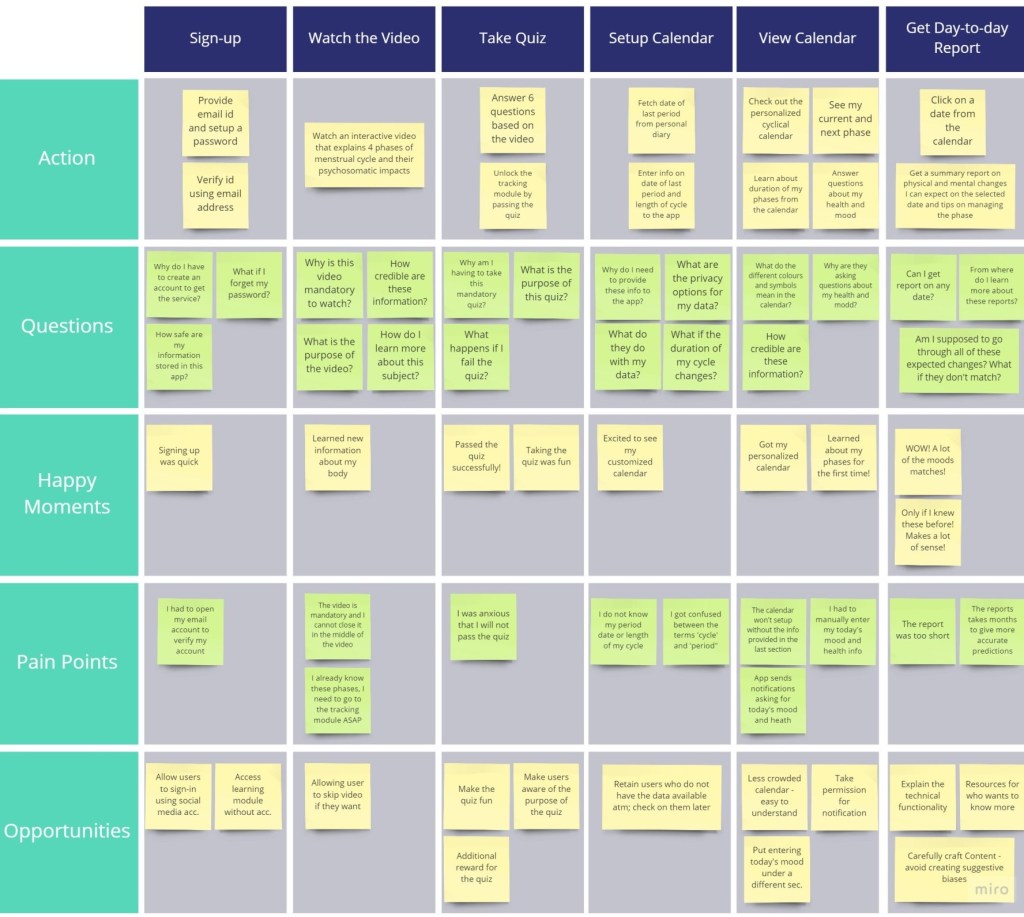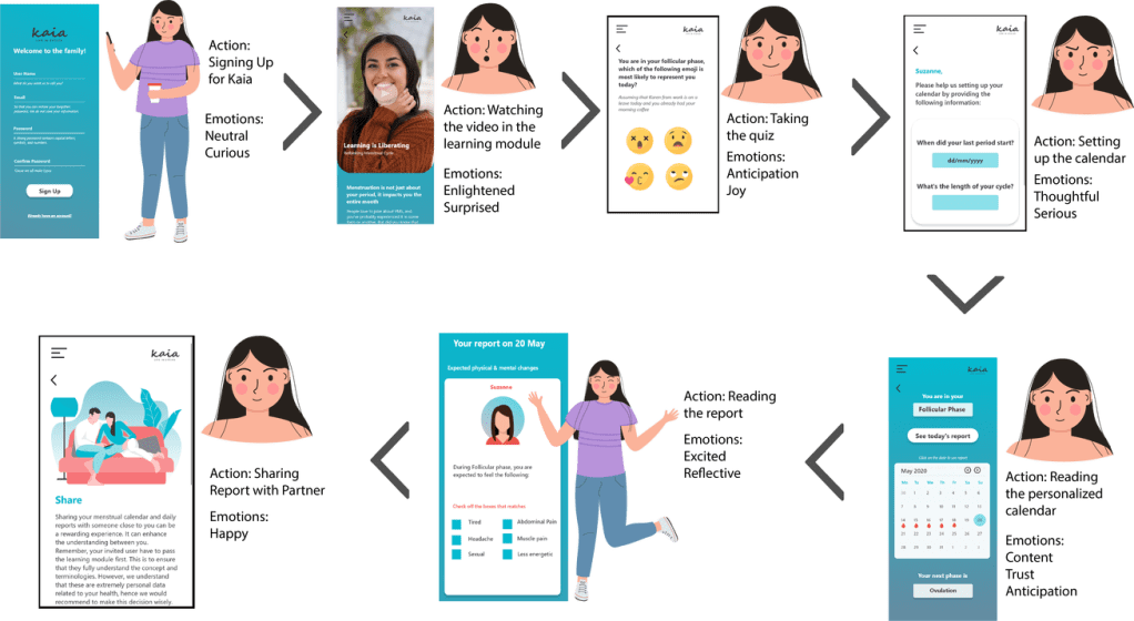 This is a user experience journey of a 21 years old person with a regular menstrual cycle. Her goals are to learn about and track the psychosomatic impacts of different phases of menstrual cycle. Her journey begins by signing up for the app, and it ends with getting her personalized mood report based on her cyclical calendar.