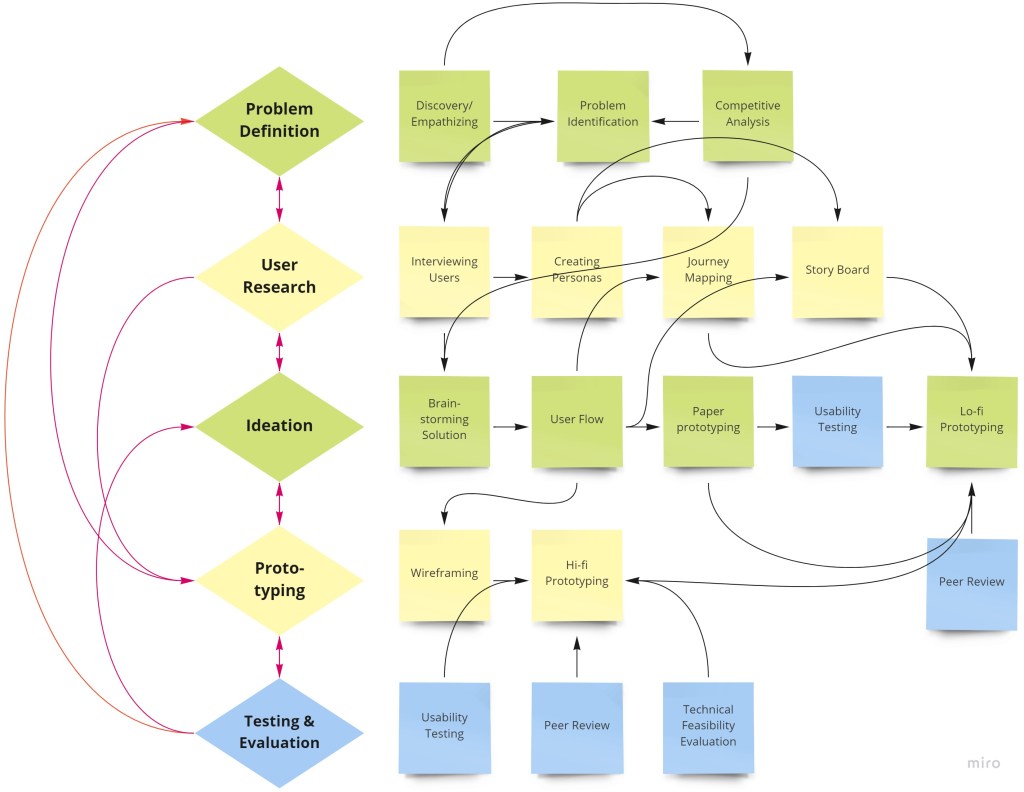 The stages of the design process have been continuously iterated as necessary to improve the solution. The following picture portrays the process and the iteration among activities at different stages of designing Kaia. User Research and user testing have been conducted at all stages of the work flow.